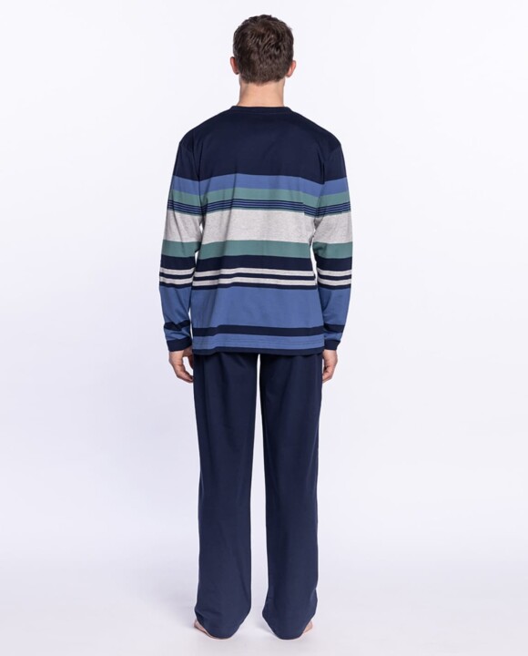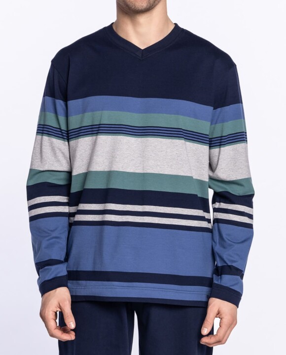 Pijama largo de algodón 100%. Camiseta de rayas en tonos azules, cuello pico y manga larga, combinada con pantalón largo liso, bolsillos laterales y cintura ajustable con cordón. Modelo muy cómodo y tejido muy agradable.