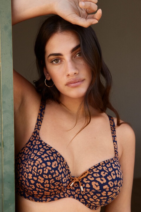 Top de bikini de copa entera y tela jacquard con un estampado animal elegante que se extiende a los tirantes.