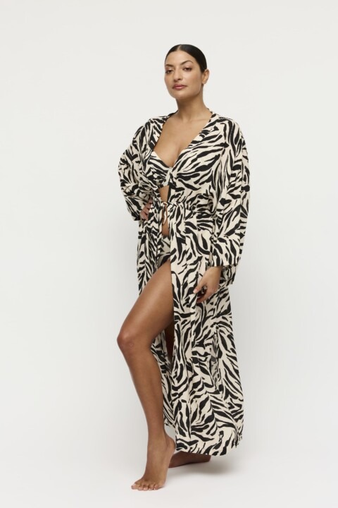 - Kimono ligero con abertura alta y mangas largas y anchas.